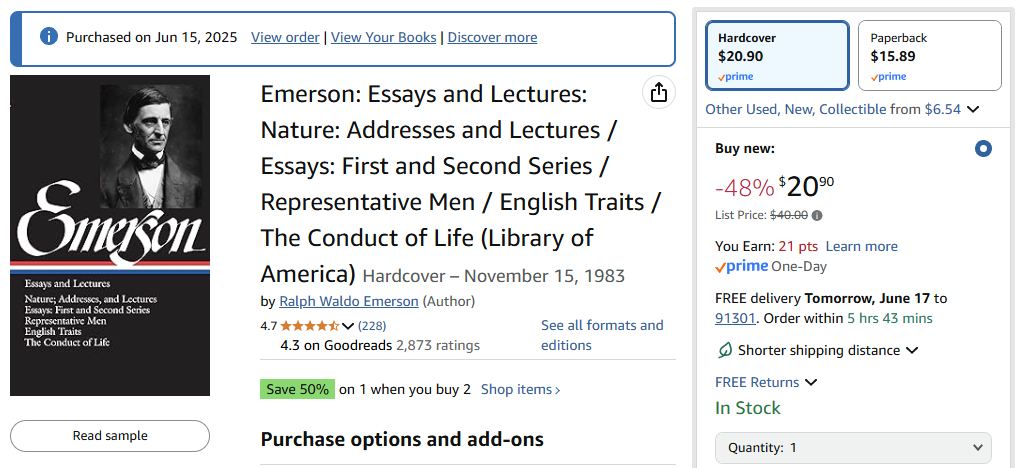 When I got back home, I knew exactly what I wanted: the essays of Emerson.